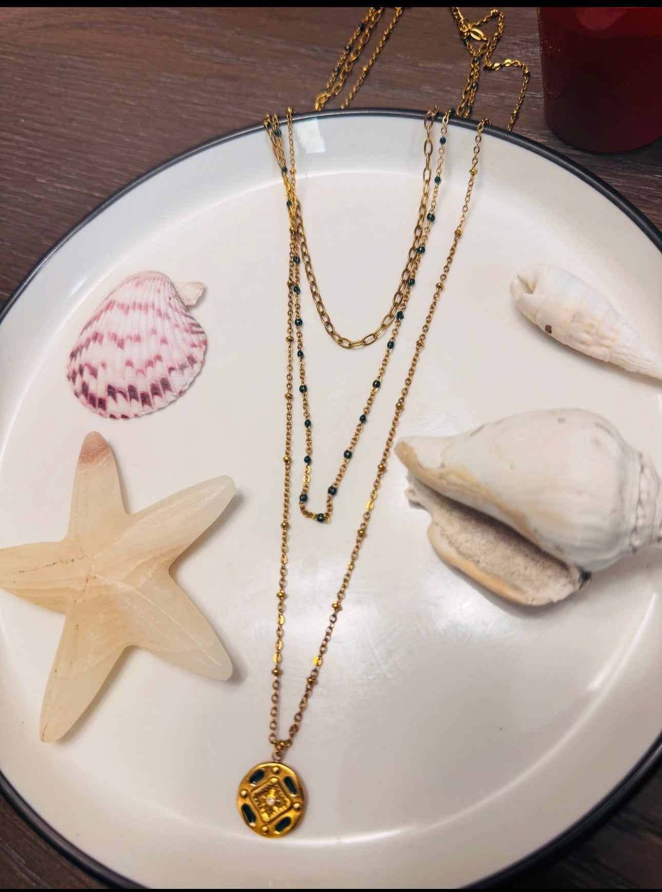 Diseño en capas con cadenas de distintos estilos, adornado con un dije redondo de patrón místico y pequeños detalles en negro. Este collar combina elegancia, profundidad y energía protectora.