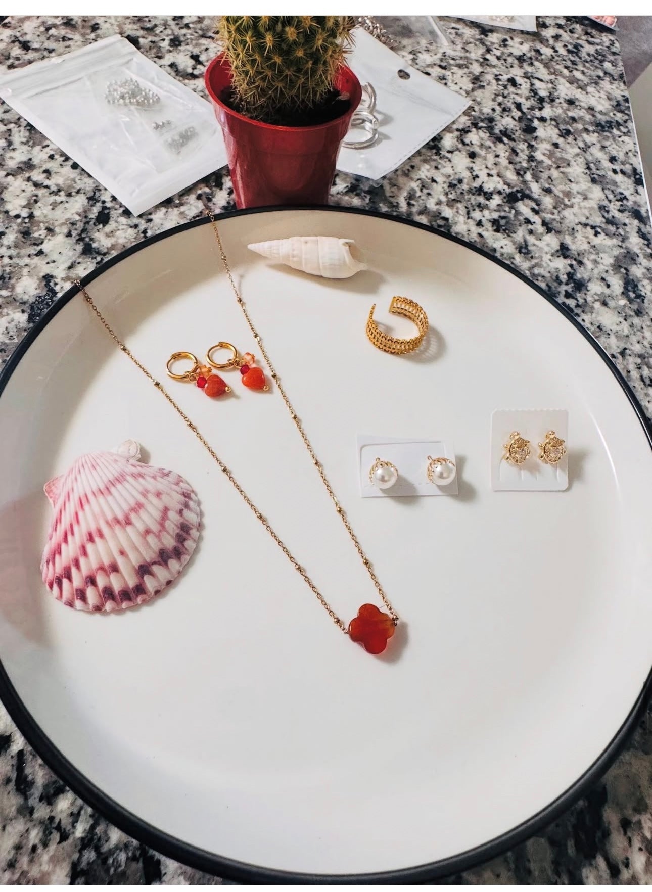 Collar con dije de flor roja + aretes de perla y detalles dorados. Una mezcla perfecta entre lo clásico y lo romántico. Ideal para regalar o lucir con elegancia.